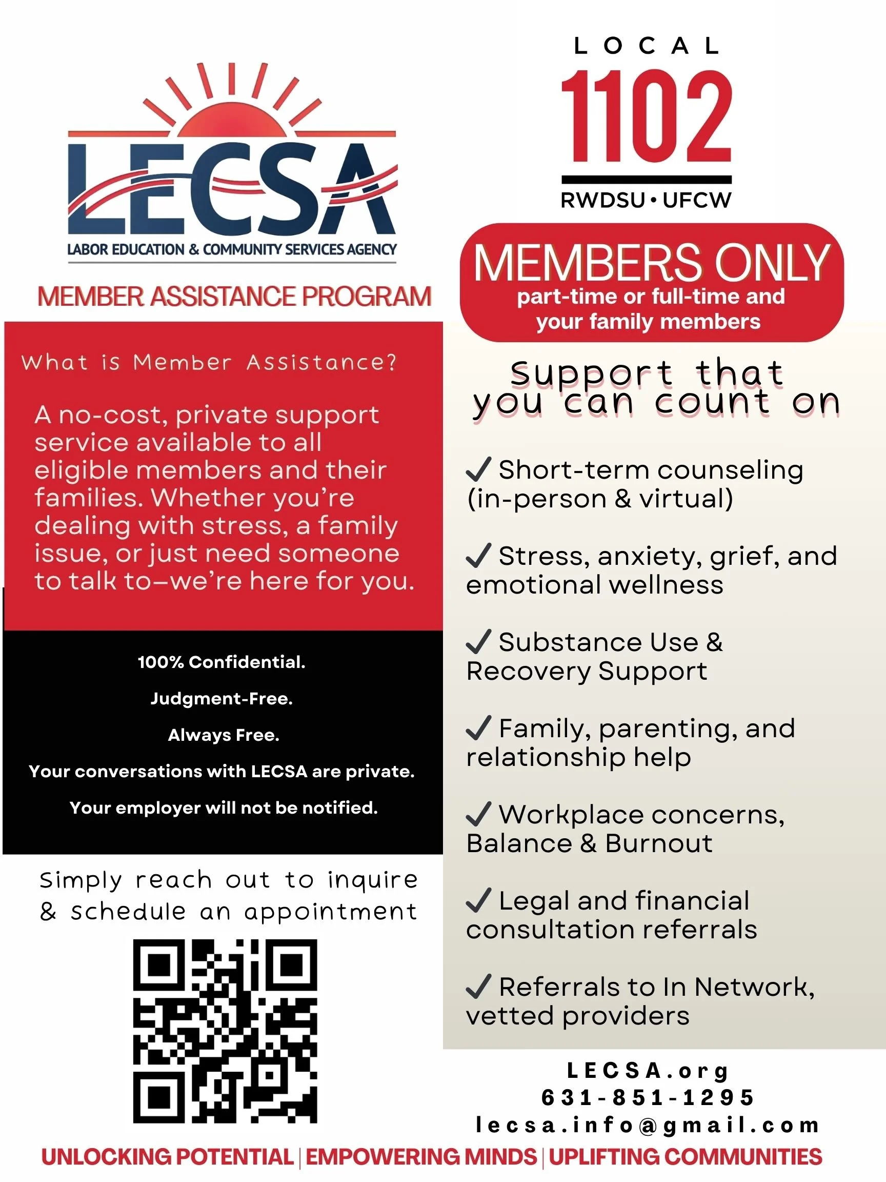 LESCA’s Member Assistance Program (MAP) is a confidential, no-cost resource available to Local 1102 members and their families, offering counseling, support, and referrals to help navigate personal or work-related challenges.